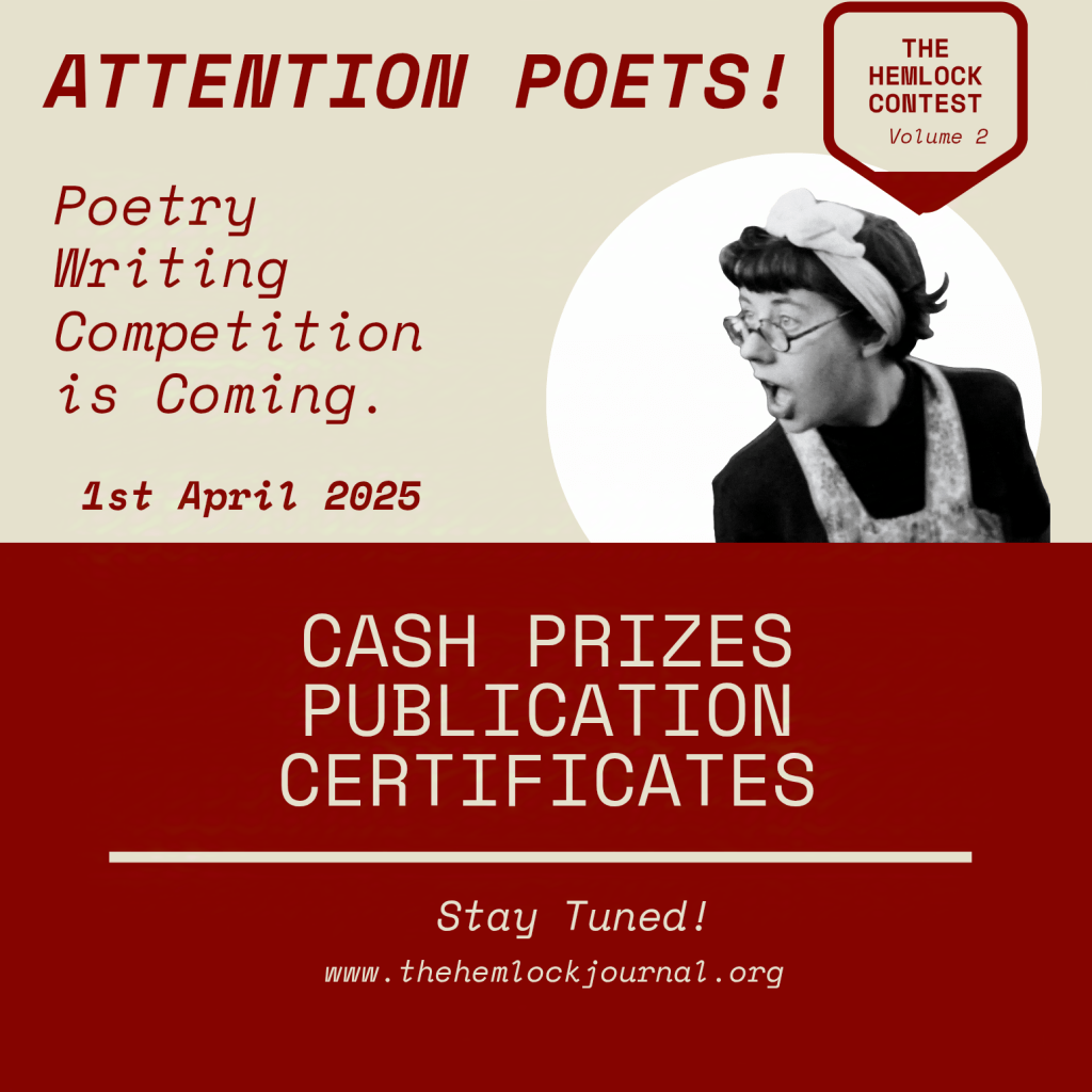 The Hemlock Journal is excited to announce The Hemlock Contest Volume 2, our second annual Poetry Competition! Poets are invited to submit their original works for a chance to win cash prizes, have their poetry published in The Hemlock Journal, and receive certificates of recognition.