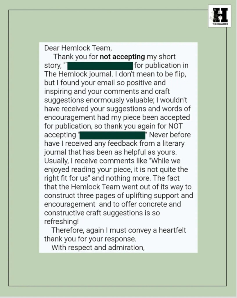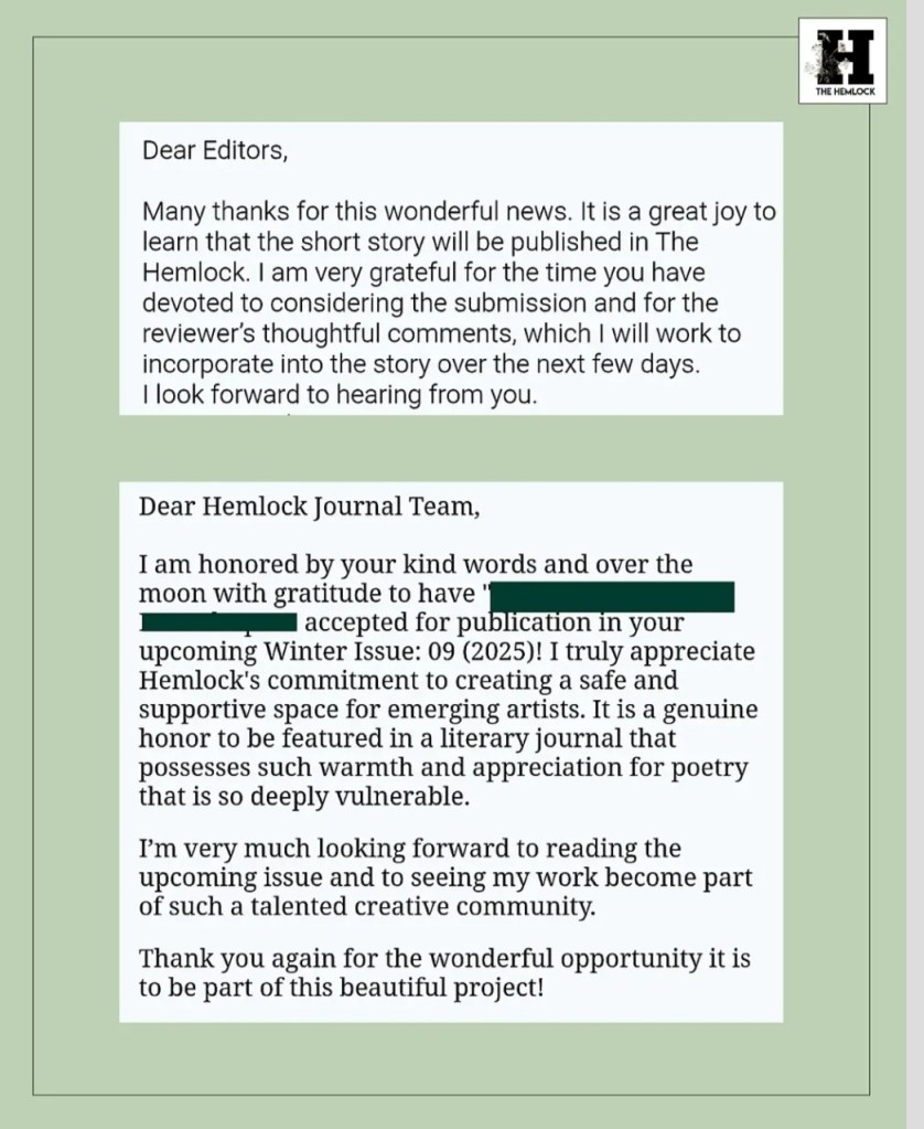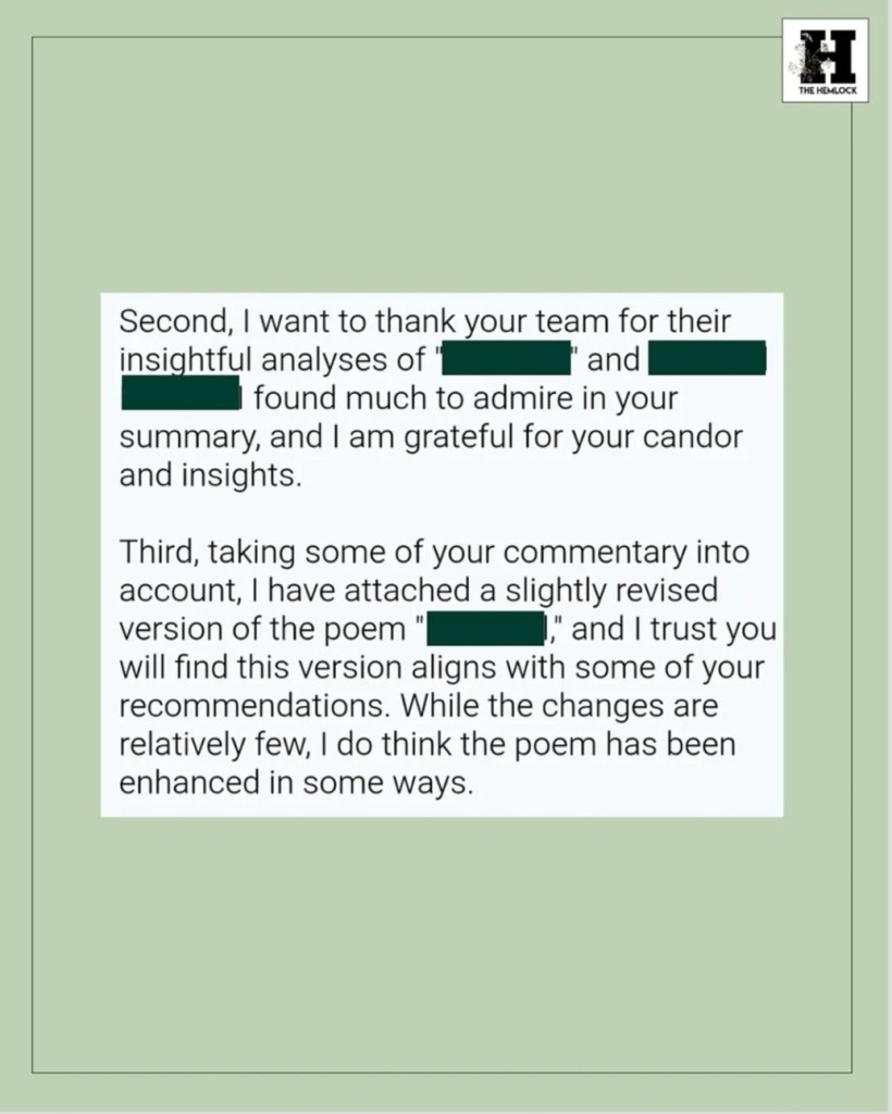 With Issue 09, The Hemlock Journal chose to alter this encounter. We introduced Expedited Review with Editorial Commentary, not as a privilege, but as a responsibility. The aim was to ensure that writers who sought an earlier response also received something more enduring than speed: clarity. The response from Issue 09 submitters was overwhelming.